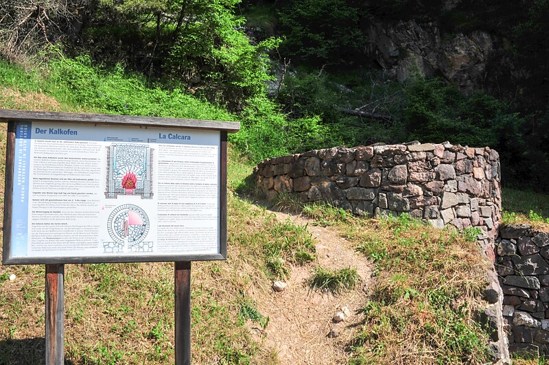 Vom Dorfzentrum Truden auf dem Weg Nr. 1 Richtung Cisloner Alm. Der Kalkofen befindet sich ungefähr auf halber Strecke.