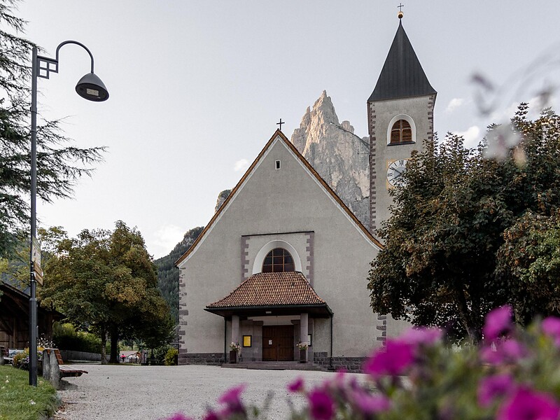 Die Pfarrkirche von Seis am Schlern liegt direkt im Zentrum. Vom Kreisverkehr geht man in Richtung Zentrum und biegt nach ca. 100 Metern links ab.