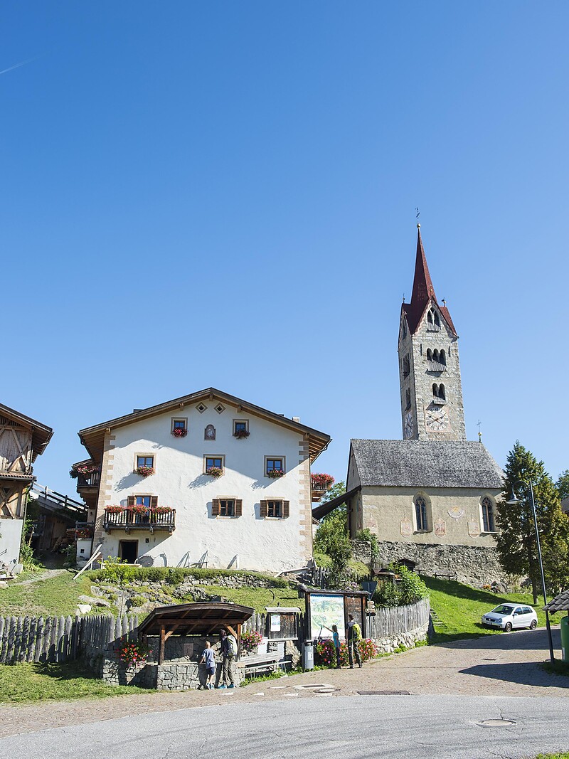 Die heutige Kirche ist gegen Mitte des 15. Jahrhunderts nach einem Dorfbrand entstanden. Wesentlich älter dürften die Mauern des Langhauses und der Schaft des Turmes sein. Rechts neben dem Portal der Kirche befindet sich ein riesiges Christophorus-Fresko, welches um 1500 entstanden sein dürfte. Links und rechts an der unteren Seite des Freskos sieht man den Hl. Nikolaus mit den drei goldenen Kugeln und den Hl. Georg mit dem Drachen, der der zweite Patron der Kirche ist. Das Kircheninnere überrascht durch Spitzbogenportal, Spitzbogenfenster mit Fischblasenmaßwerk und dreijöchiges Netzgewölbe. Der barocke Hochaltar (1720) zeigt den Hl. Nikolaus der zur Muttergottes mit dem Kind schaut und seine Bauernheiligen Silvester, Georg, Margareth und Valentin. Das Schmuckstück der Kirche ist der kunstvolle gotische Flügelaltar („Georgsaltar“, 1520) vom Brixner Künstler Andre Haller. Im Mittelteil sieht man den Hl. Georg auf dem Pferd im Kampf gegen den Drachen. Rechts kniet Margareth mit dem Lamm und betet für einen guten Ausgang des Kampfes. Hinten links sind die Eltern des Georg und hinten rechts die Enthauptung Georgs dargestellt. An den Flügeln sieht man den Hl. Joachim mit Buch und die Hl. Mutter Anna mit Maria und dem Jesuskind. Die Außenseiten der Flügel sind mit den zwei Heiligen Nikolaus und Erasmus bemalt. Die Kirche ist grundsätzlich versperrt, der Schlüssel kann beim Mesnerhaus geholt werden.