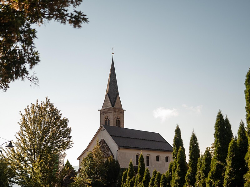 Die Kirche wurde 1433 geweiht. Wertvolle Fresken aus dem XV. Jh.; auf einem der Fresken kann man die Mayenburg in ihrer ursprünglichen Form erkennen.