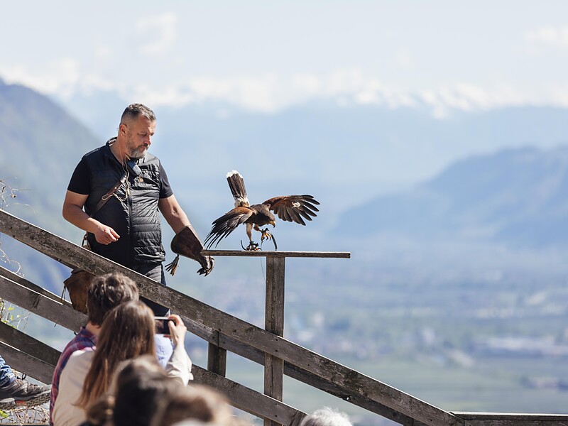 Am Burghügel von Schloss Tirol werden seit 1998 verletzte Greifvögel in speziellen Volieren artgerecht versorgt und gesund gepflegt, bis sie wieder in die freie Wildbahn entlassen werden können. Flugunfähige Tiere finden im Zentrum eine dauerhafte Bleibe. Gesunde Vögel können dank der günstigen Hanglage täglich über dem Schlosshügel fliegen. Besucher der Pflegestation erleben bei den Flugvorführungen zweimal täglich das Schwingen und Gleiten der Greifvögel. Die Vogelexperten Willy Campei und Florian Gamper informieren darüber hinaus über das Leben der Greifvögel im Einklang mit der Natur und über notwendige Schutzmaßnahmen. Auf einem wunderbar angelegten, in die Landschaft integrierten Lehrpfad wird dem Besucher das faszinierende Leben der Greifvögel als wichtige Glieder im Kreislauf der Natur nähergebracht.