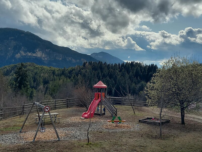 Wunderbarer sonniger Kinderspielplatz beim Sportcenter in Aldein mit Panoramablick ins Fleimstal.