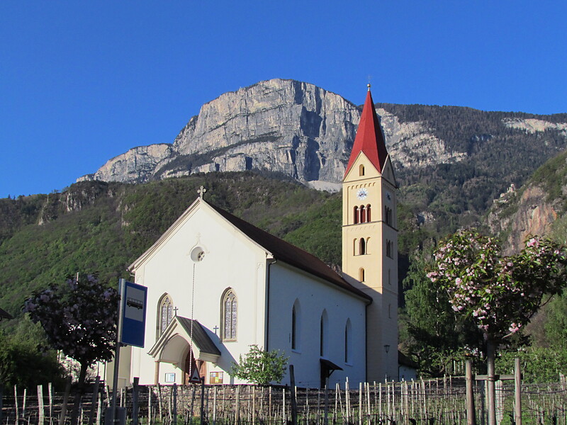 Andrians Pfarrkirche ist dem Heiligen Valentin geweiht. Das Patrozinium zum hl. Valentin lässt hier schon sehr früh ein Gotteshaus vermuten. Die erste urkundliche Erwähnung einer Kirche stammt aus dem Jahre 1231. Der älteste Teil der heutigen Kirche besteht aus dem unteren Abschnitt des Turmes mit den dreiteiligen Spitzbogenschallfenstern. Das Langhaus jener Zeit ist leider nicht mehr erhalten geblieben, wohl aber ein Teil des im frühen 16. Jh. errichteten Baues, der heute den Chor der Kirche bildet und mit seinen Spitzbogenfenstern und dem Sternrippengewölbe seine spätgotischen Elemente erhalten hat. Einige Fresken aus jener Zeit sind in der heutigen Sakristei noch zu sehen, sind aber der Öffentlichkeit nicht zugänglich, und ebenso die Statuen Maria mit Christkind, St. Sebastian, St. Anna, St. Barbara und St. Katharina wurden Ende 15./frühes 16. Jh. datiert. Diese befinden sich im neugotischen Flügelaltar, der erst 1904 entstanden ist. Der ganze Rest der Kirche, so das Langhaus und der obere Teil des Turmes, wurden hingegen erst im 19. Jh. (Langhaus 1852-1854, Turm 1883) errichtet und 1864 entstanden die Seitenaltarbilder aus der Hand von Anton Psenner.